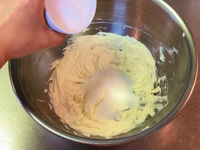 (3)無塩バターがなめらかになってきたら、グラニュー糖を3回ほどに分けて入れ、その都度ハンドミキサーでよく混ぜます。