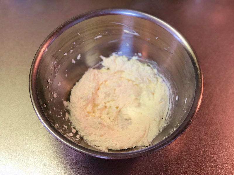 (2)別のボウルに常温にしておいた無塩バターを入れ、ハンドミキサーで柔らかく練ります。