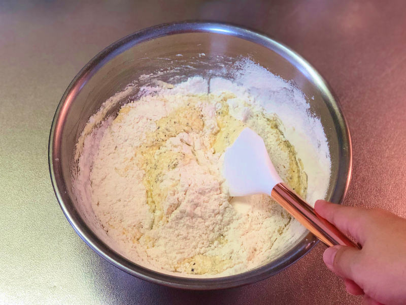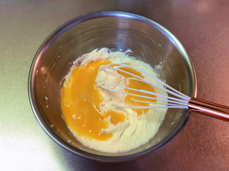 Jの文字を書くように、片方の手ではボウルを回しながら混ぜていくと、粉っぽさが早くなくなり生地がまとまりやすいです。