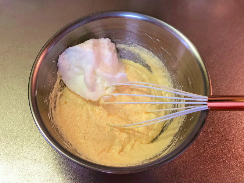 (5)さきほど泡立てておいた卵白を入れて混ぜ合わせます。