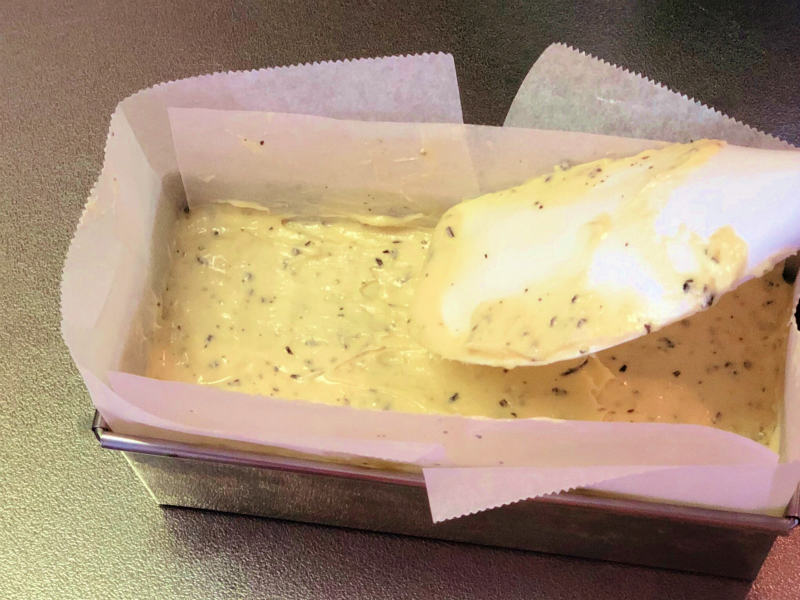 (9)生地に粉っぽさがなくなったら、クッキングシートを敷いた型に生地を入れていきます。