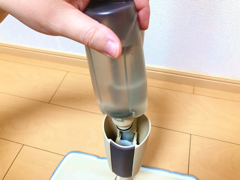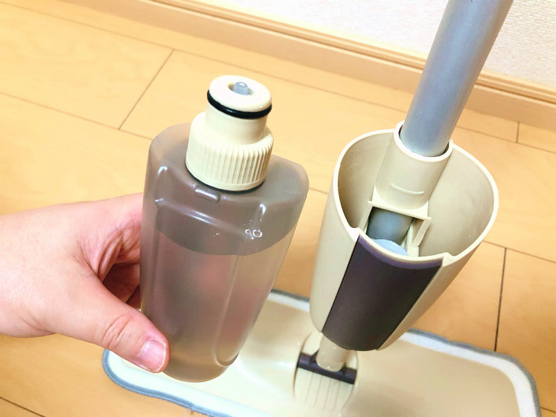 ご覧の通り、液体(水や洗剤)を入れるタンクが付いていて、使い方としてはタンクの中の液体をワシャー!と吹きかけながらモップで拭いていきます。