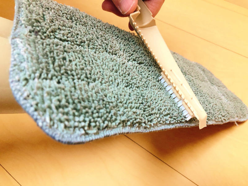 モップにホコリや髪の毛などが絡み付いて汚れてきたら、付属のブラシでかんたんに掻き落とせるのもとっても良い!!!