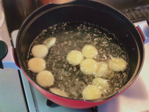 最初、下に沈んでいる団子ですけど、火が通って茹で上がると、ふわ〜っと上に浮いてきます。