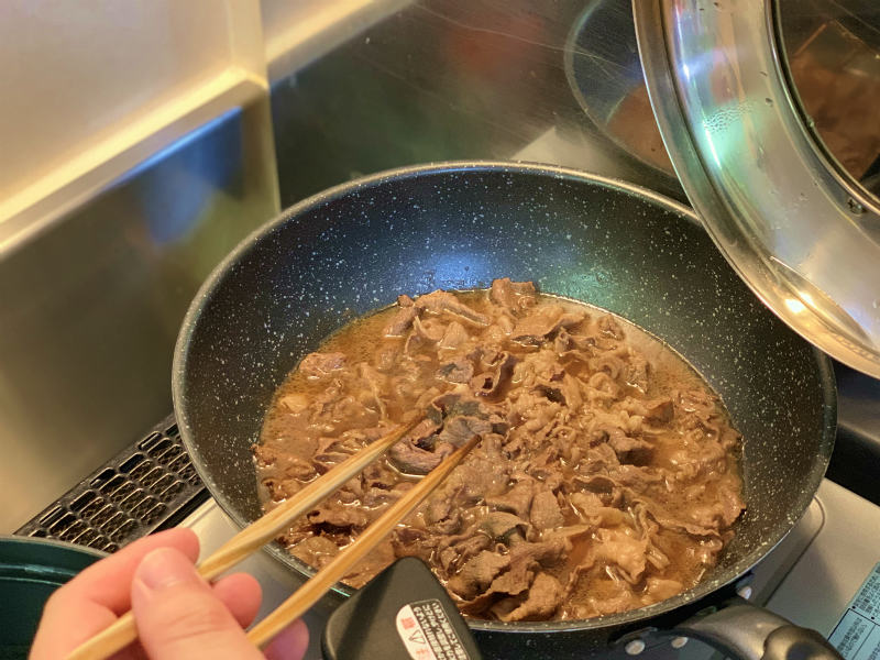 とりあえず全て入れた煮汁が煮立ったところで肉の投入。