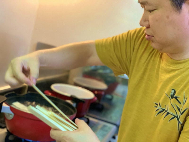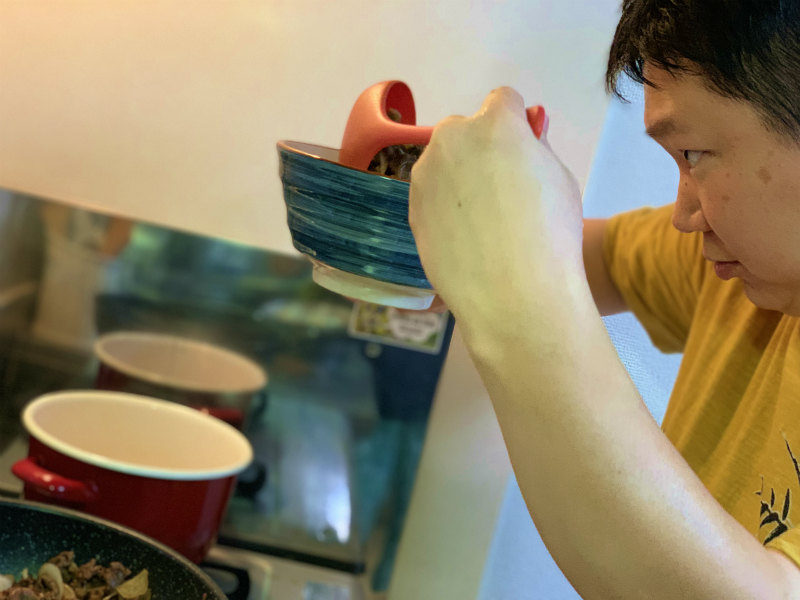 砂糖、しょうゆ、しょうがチューブで味を整えていくぞのちゃん氏。