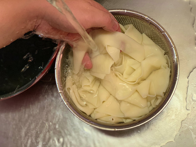 茹で上がったらザルにとり冷水で揉み洗いします。