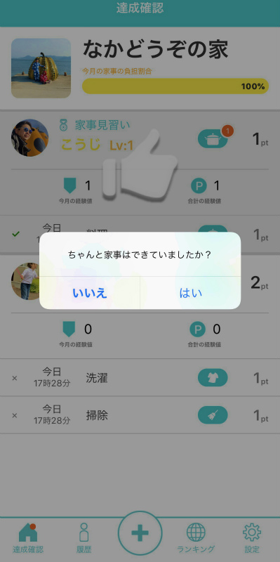 この「いいね」のところをタップしたら、「ちゃんと家事はできていましたか?」の表示が出てきて、ちゃんとできていたら、「はい」をタップします。