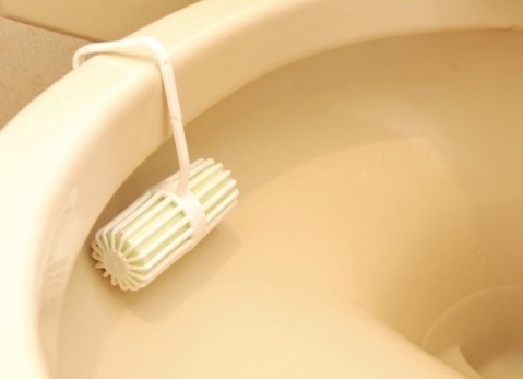便器にひっかけてある【トイレパワーブロック】は、水が触れるところにひっかけておくだけで、便器や排水管に付く尿石を徐々に除去していきます。