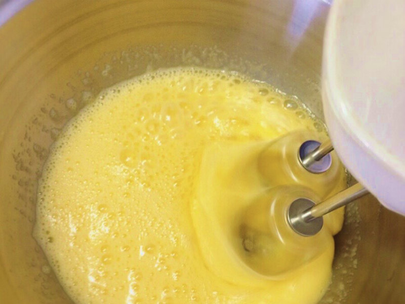 ① 全卵をボウルに割り入れ、ハンドミキサーで軽く溶いたあと、グラニュー糖を入れてさらに混ぜていきます。
