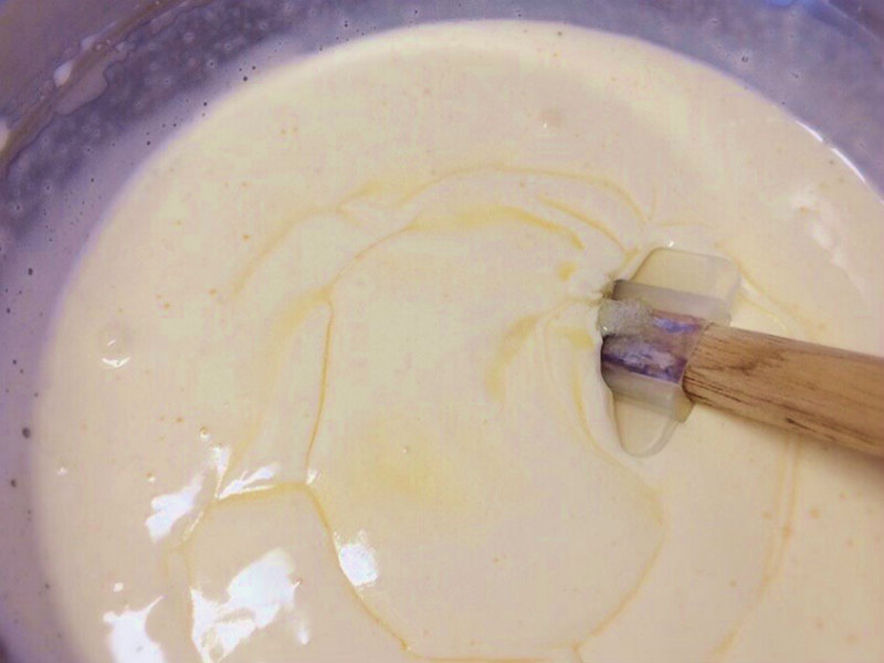 写真のような卵の黄色っぽさが、ずっと混ぜていることでだんだん白くなり、すーっと生地を持ち上げたときにモタっと感が出て8の字が書けるようになってきます。