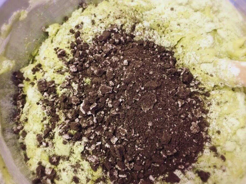 ④大体生地が合わさったら、砕いておいたオレオ3枚分を加え、さらに混ぜ合わせます。
