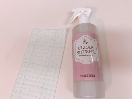 不織布にしっとりするくらいのクリアシュシュを吹き付けて、中から外へ拭いていきます。